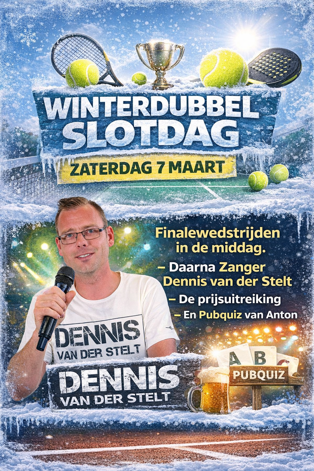 Op de slotdag zaterdagmiddag 7 maart maken we er een extra gezellig dag van. We spelen 's middags de finales en daarna komt Zanger Dennis van der Stelt er een lekker feestje van maken. We sluiten de middag af met de prijsuitreiking en de beruchte Pubquiz van Anton!
