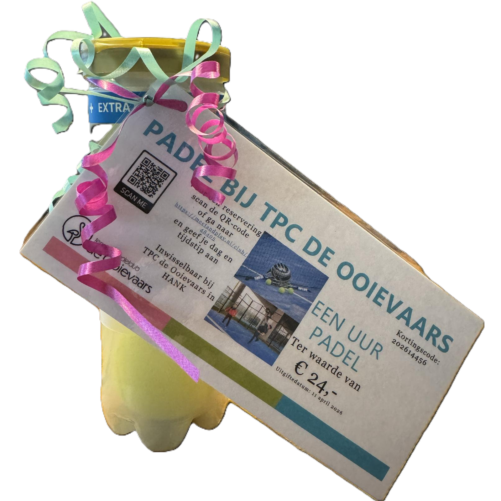 We hebben een cadeau bon voor 1 uur padellen t.w.v. 24 eur. Dit is de normale huurprijs voor een uur. Maar 2 uur of meer kan natuurlijk ook. Geef maar aan wat je wilt.