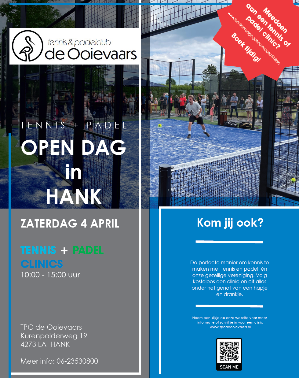 Op zaterdag 4 april organiseren we weer onze Open Dag met kosteloos clinics voor zowel tennis als padel. De perfecte manier om kennis te maken met deze sporten én onze gezellige vereniging.
