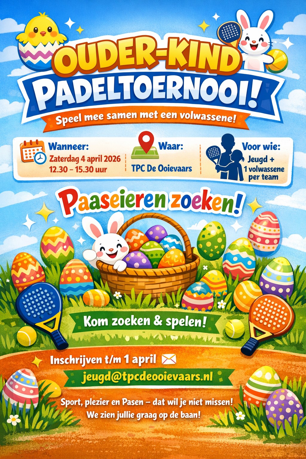Op zaterdag 4 april van 12:30 - 15:30 uur organiseert de jeugdcommissie het ouder-kindtoernooi voor padel. Op deze middag spelen kinderen met een volwassene. Lidmaatschap of ervaring is geen vereiste. Met wie speel jij mee? Meld je aan voor 1 april!