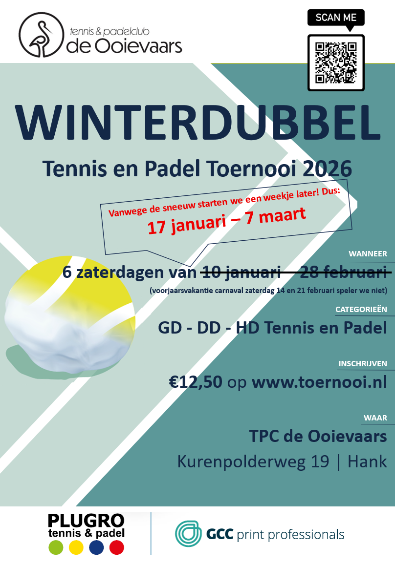 Op zaterdagmiddag 17 januari start bij onze club het GD-DD-HD Wintertoernooi. Het Wintertoernooi wordt gespeeld op zes zaterdagen in de maanden januari en februari in verschillende speelsterkten in de Gemengd Dubbel, Dames Dubbel en Heren Dubbel. Samen voor leden en niet-leden om het jaar 2026 sportief te beginnen met tennis en padel! Ideaal om je voor te bereiden op de competitie en toernooien. Maar vooral veel gezelligheid en plezier!